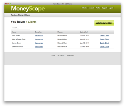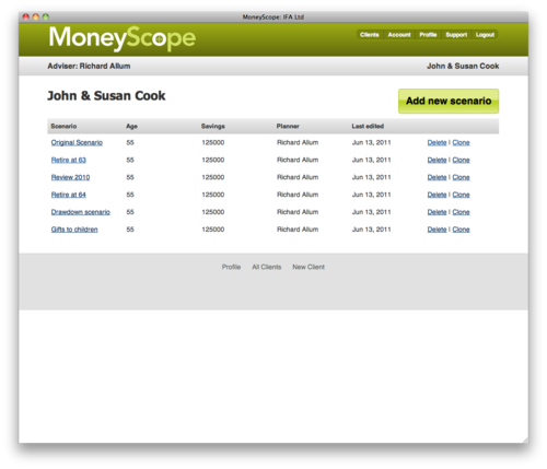 When you view the all clients page, it lists all of your existing clients, just as it does now, but with one important addition: it includes a new column showing the number of scenarios for each client.