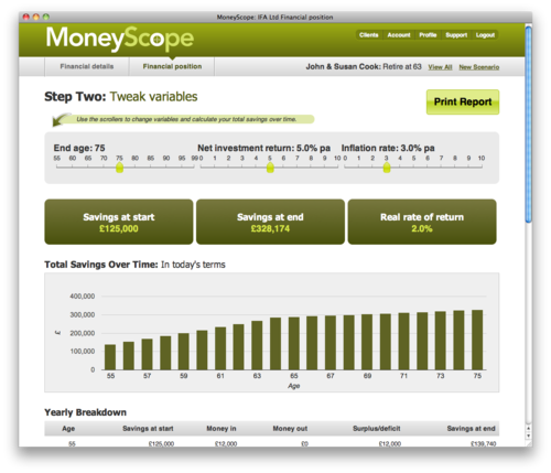 This is a screen which regular users will be familiar with. Just tweak the variables as usual, save and - voila! - you've created a new scenario for your client without altering the original record that you set up.