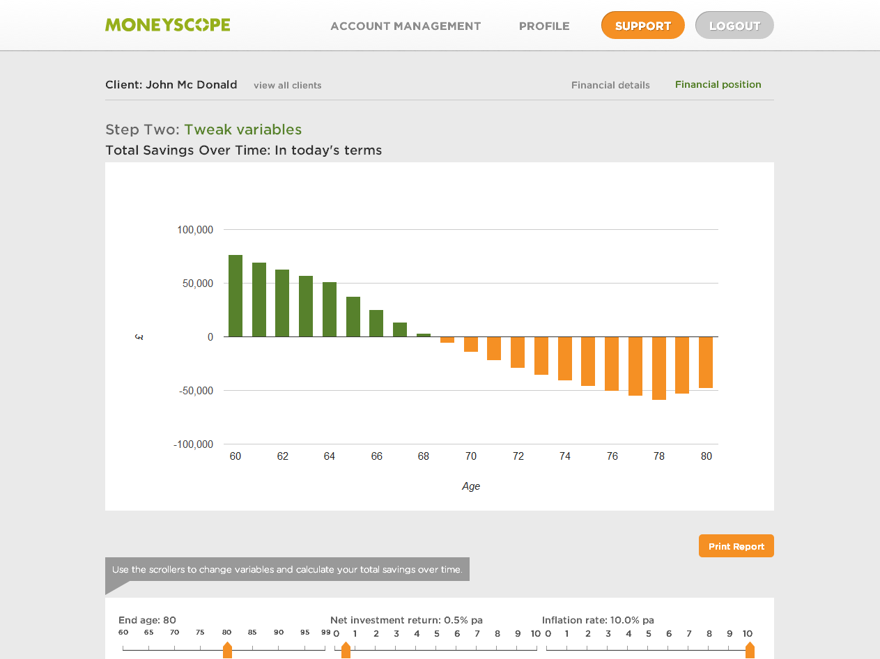 When you come to print out a report, however, Moneyscope will keep the green bars green, but the orange bars will become red so your clients get a report where their cash is either in the green or in the red.