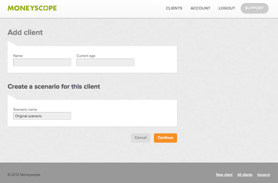 To start with, it's going to be easier to edit client information once you've added it. When adding a new client you will be directed to the screen below. It's here that you can add a client's name and age as well as start to build a cash flow forecast for your client.