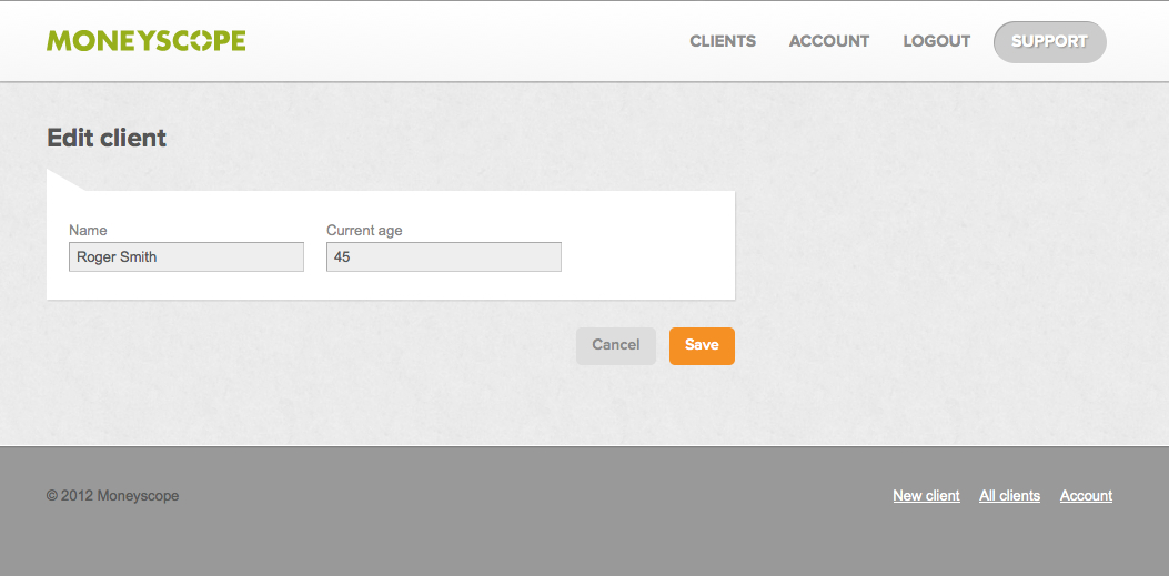 And say, for instance, that at some point in the future you want to edit the client's name or age, click on the client's name at the top of the scenario and you'll be directed to the edit client screen where you can change this information. This will then be applied to all the scenarios you've built for that client.